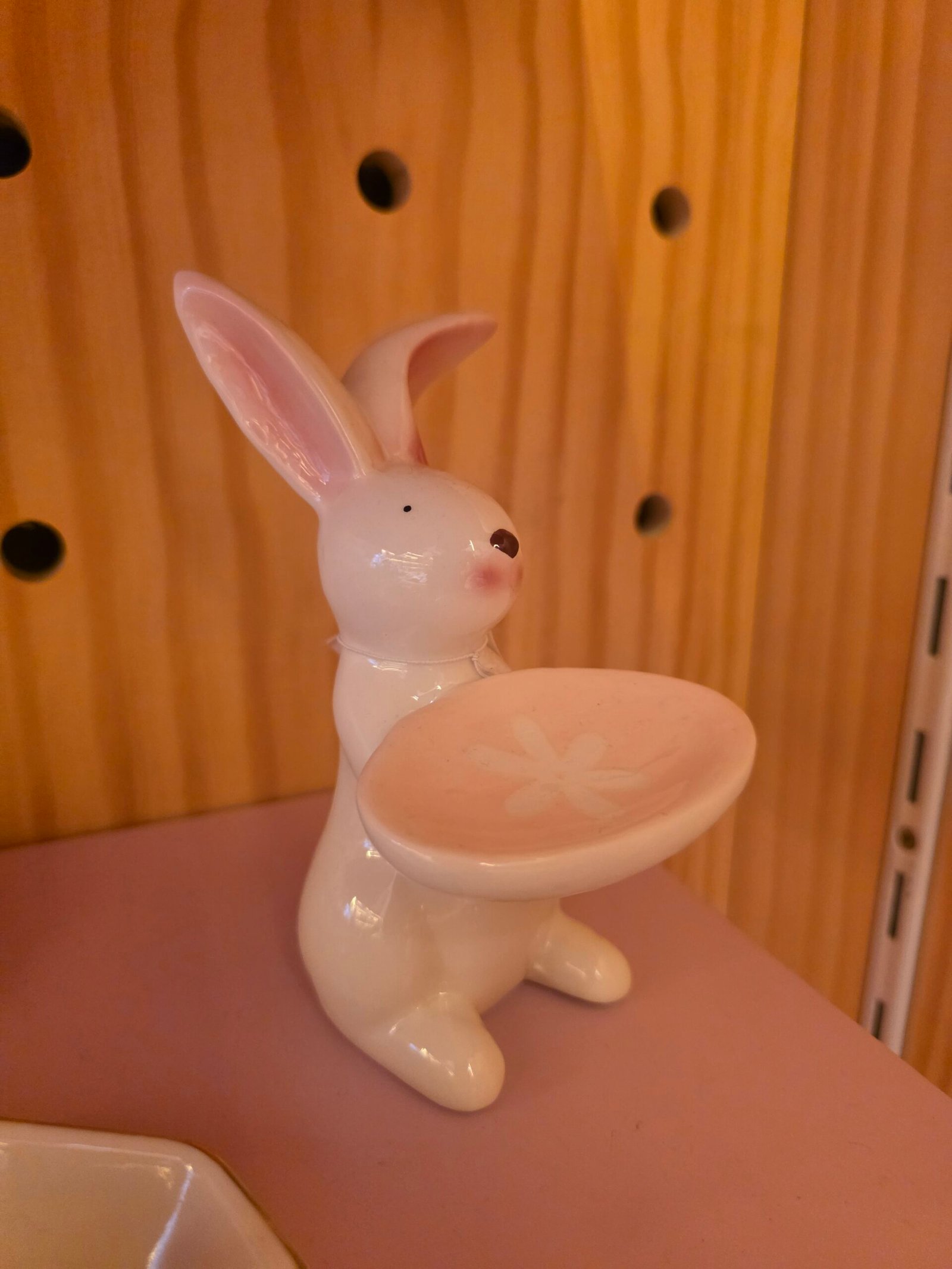 Um coelhinho segurando um pequeno pratinho onde os acess?rios descansam com charme. Ideal para guardar an?is e brincos e ainda trazer um toque delicado e divertido para a decora??o.